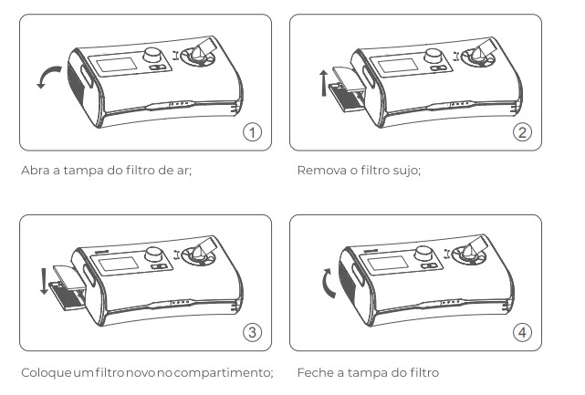 Filtra impurezas, poeira, alérgenos e microrganismos presentes no ar, garantindo uma terapia mais segura e um fluxo de ar mais limpo para o usuário. Também protege o equipamento contra o acúmulo de sujeira e prolonga sua vida útil.